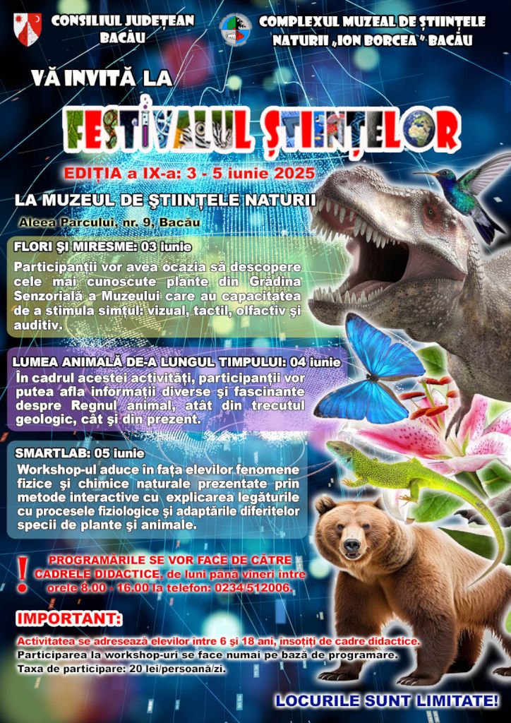 Proiectul cultural „Festivalul Științelor”, organizat de Complexul Muzeal de Științele Naturii „Ion Borcea” Bacău, a ajuns anul acesta la a IX-a ediție. Acest eveniment abordează prezentarea informațiilor, machetelor și exponatelor autentice într-un cadru non-formal la work-shop-urile organizate, elevii fiind implicați în realizarea activităților.