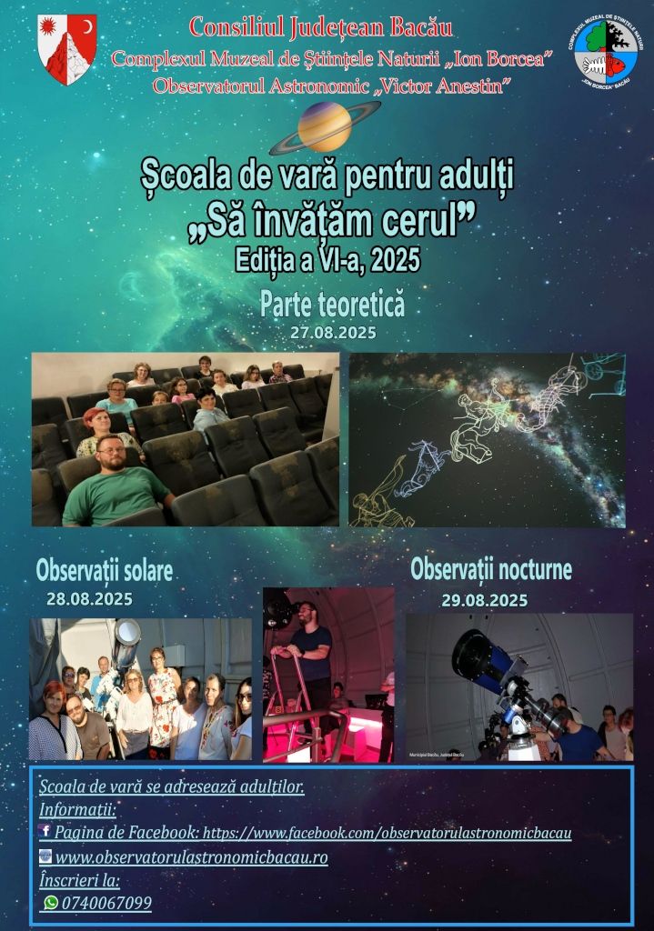 Observatorul Astronomic „Victor Anestin” din cadrul Complexului Muzeal de Științele Naturii „Ion Borcea” Bacău, organizează în perioada 27 – 29.08.2025, școala de vară de inițiere în astronomie, pentru adulți intitulată: Să învățăm cerul” ajunsă la ediția a VI a. Menținem proiectul cultural, lansat în anul 2019, care este dedicat adulților interesați să pătrundă în tainele astronomiei. La finalul perioadei, participanții vor dobândi cunoștințe despre componentele Sistemul nostru Solar, misiuni spațiale, constelații și generalități despre Universul vizibil.