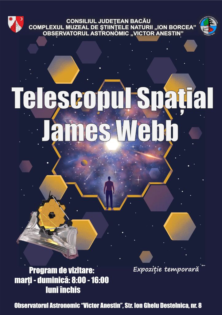 Complexul Muzeal de Științele Naturii „Ion Borcea” Bacău, vă invită în data de 15 decembrie, ora 11.00, la sediul Observatorului Astronomic „Victor Anestin” din str. Ion Ghelu Destelnica nr. 8, să participaţi la vernisajul expoziției temporare intitulată „Telescopul Spațial James Webb”.